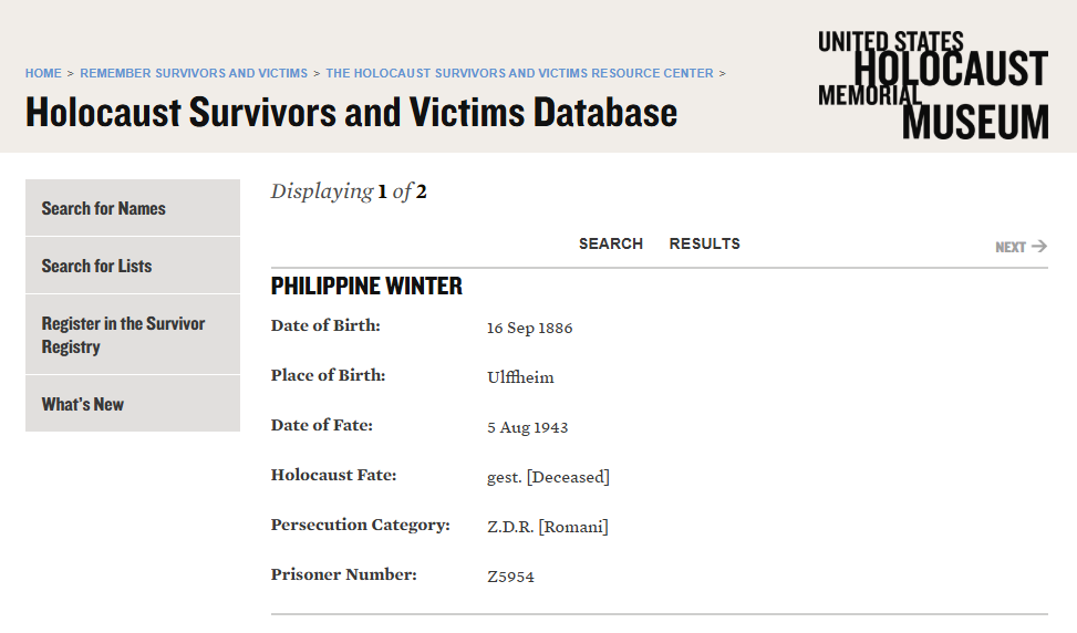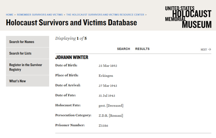 Here are the records for all my six paternal great-grandparents and great-great-grandparents from the Zigeunerbuch and the Holocaust Survivors and Victims Database.