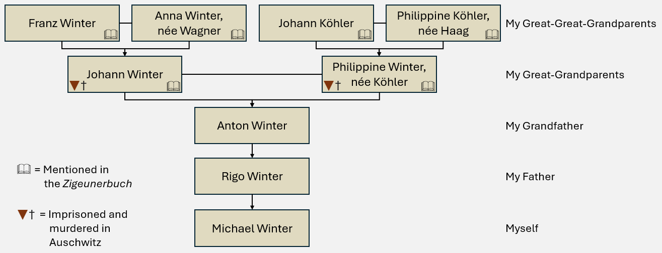 Above is a portion of my family tree, focusing on my fatherâs lineage - specifically, his paternal side. All six of his paternal grandparents and great-grandparents were listed in the Zigeunerbuch, and both of his paternal grandparents were imprisoned and murdered in Auschwitz.