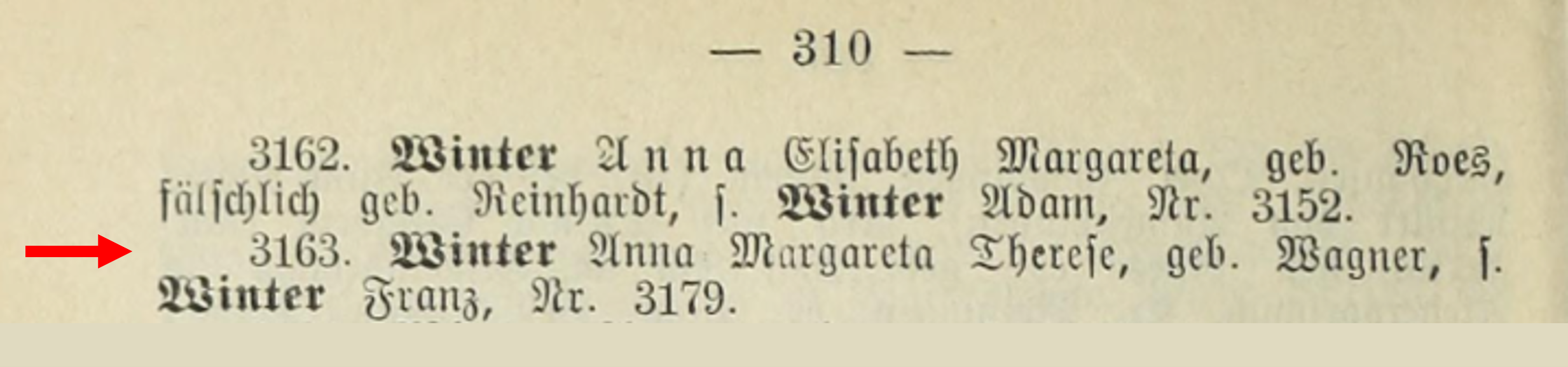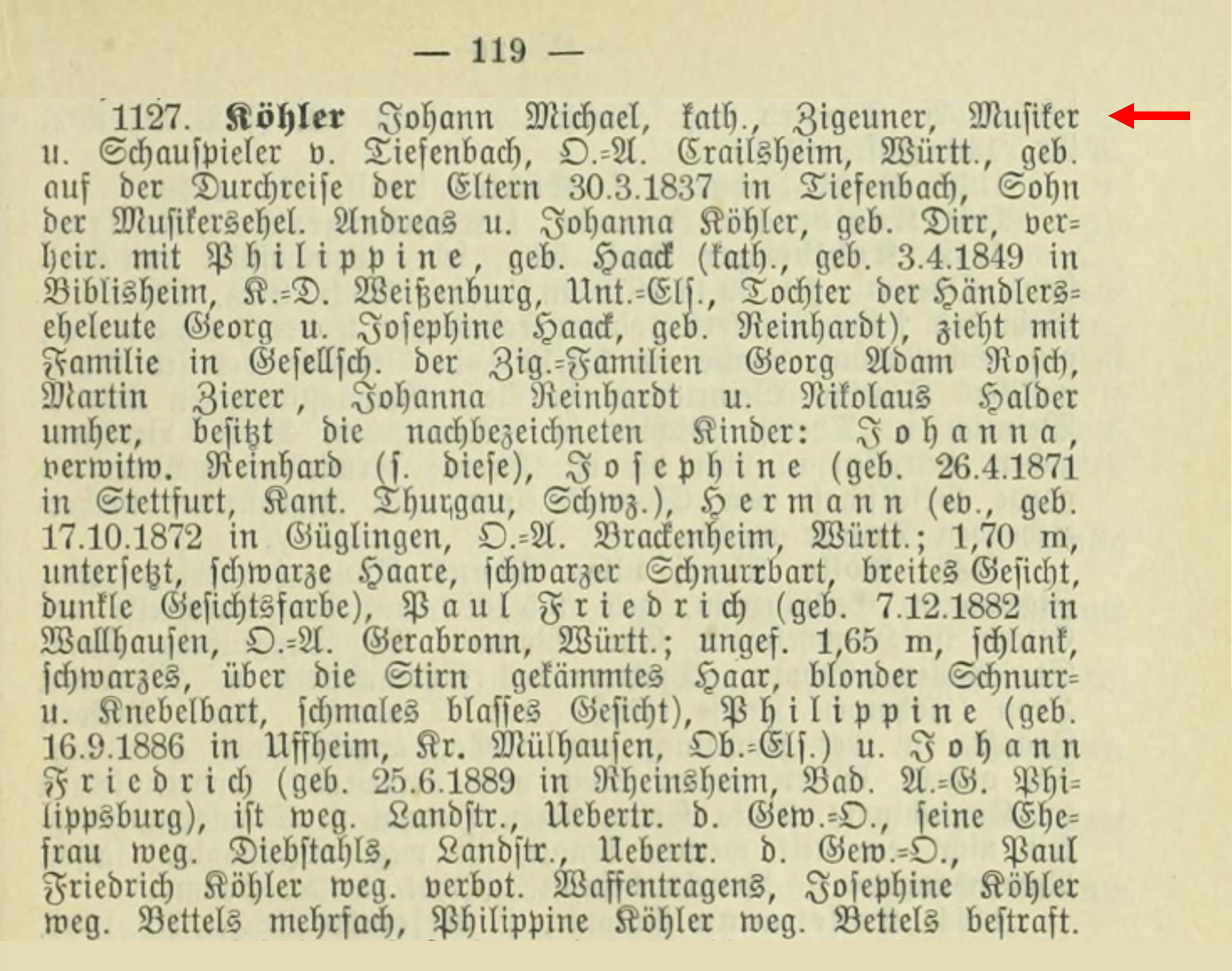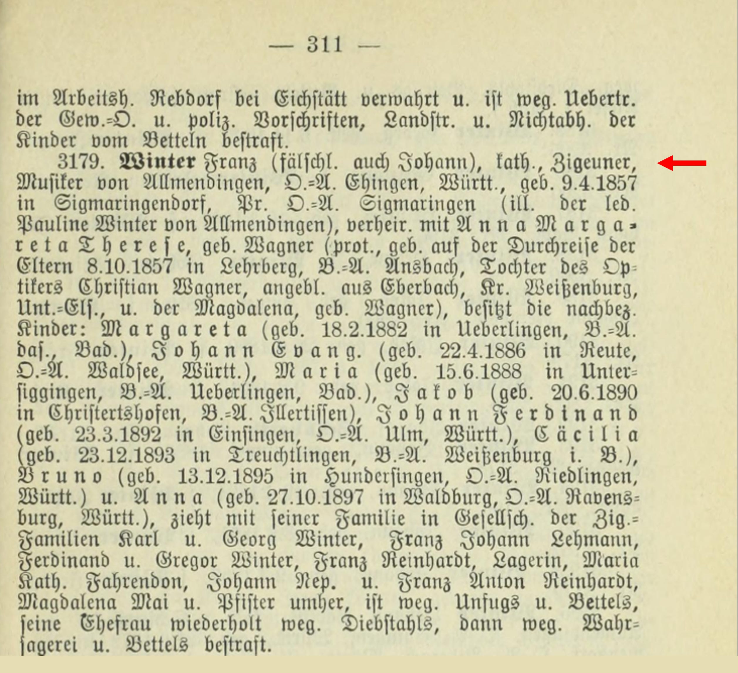 Winter, Franz (falsely also Johann), Catholic, "Gypsy," musician from Allmendingen, District Office Ehingen, WĂźrttemberg, born September 4, 1857, in Sigmaringendorf, District Office Sigmaringen (illegitimate son of the unmarried Pauline Winter from Allmendingen), married to Anna Margareta Therese, nĂŠe Wagner (Protestant, born while her parents were traveling on October 8, 1857, in Lehrberg, District Office Ansbach, daughter of optician Christian Wagner, reportedly from Eberbach, District Weissenburg, Unterfranken, and Magdalena, nĂŠe Wagner).